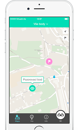 Mapa v aplikaci Virtuální Aš zobrazuje pozici jednotlivých pozorovacích bodů pro prohlížení virtuálních historických objektů a dále při hraní Hry postupně odkrývá její jednotlivá stanoviště, přes která herní okruhy procházejí. Po kliknutí na bod v mapě se zobrazí jeho detail s dalšími infomacemi. Pomocí mapy se jednoduše dostanete na místo, který chcete pozorovat a jehož historie vás zajímá.